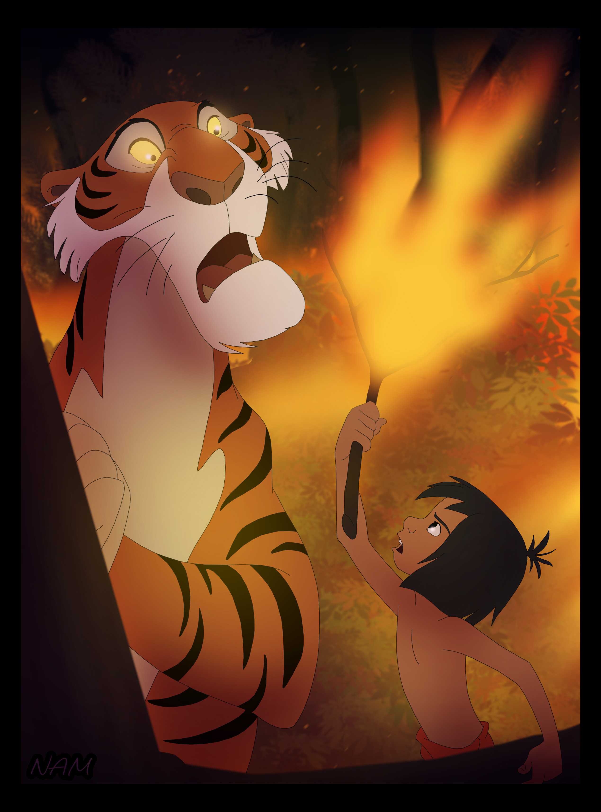 "I have it!" said Bagheera, leaping up. “Go thou down quickly to the men’s huts in the valley, and take some of the Red Flower which they grow there, so that when the time comes thou mayest have even a stronger friend than I or Baloo or those of the Pack that love thee. Get the Red Flower.”The illustration above shows Mowgli attacking Shere Khan with a blazing torch. Seeing Jamie struggling with the bear, Claire remembered the Kipling story, but lacking a suitable branch to use as a torch, her response was somewhat different: